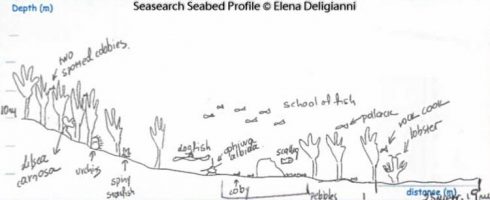 The top of the bedrock wall supports a dense kelp forest, which tails off with depth down the wall. The lower part of the wall supports a variety of red seaweeds.