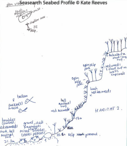 A vertical rocky wall descending to approximately 18m. This gently slopes out to a flat, mixed sediment seabed with sparse boulders.