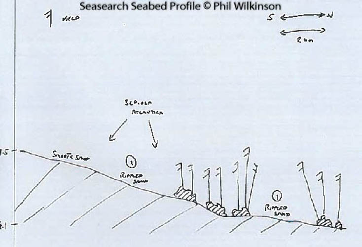 The site is a sandy seabed with areas of rock covered in mixed seaweed, including kelp (similar to the dive site at Groomsport Beach West).