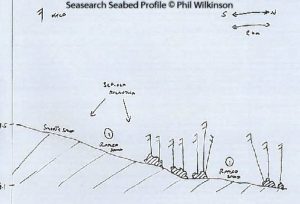 The site is a sandy seabed with areas of rock covered in mixed seaweed, including kelp (similar to the dive site at Groomsport Beach East).