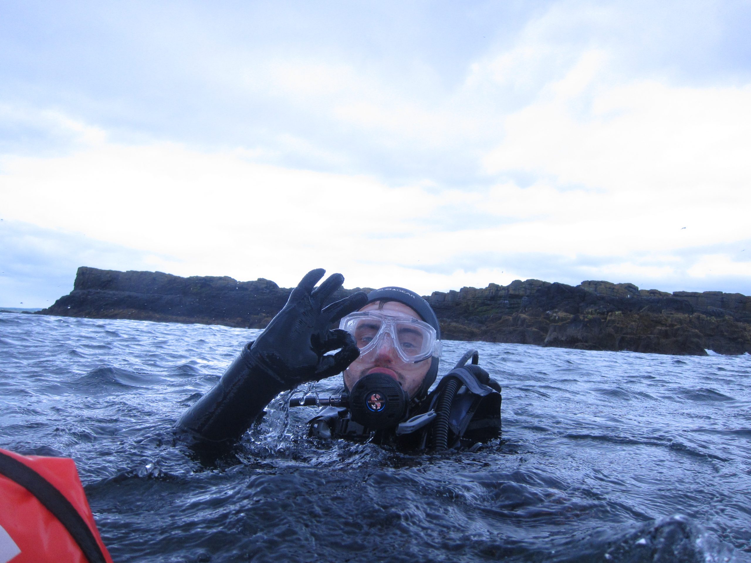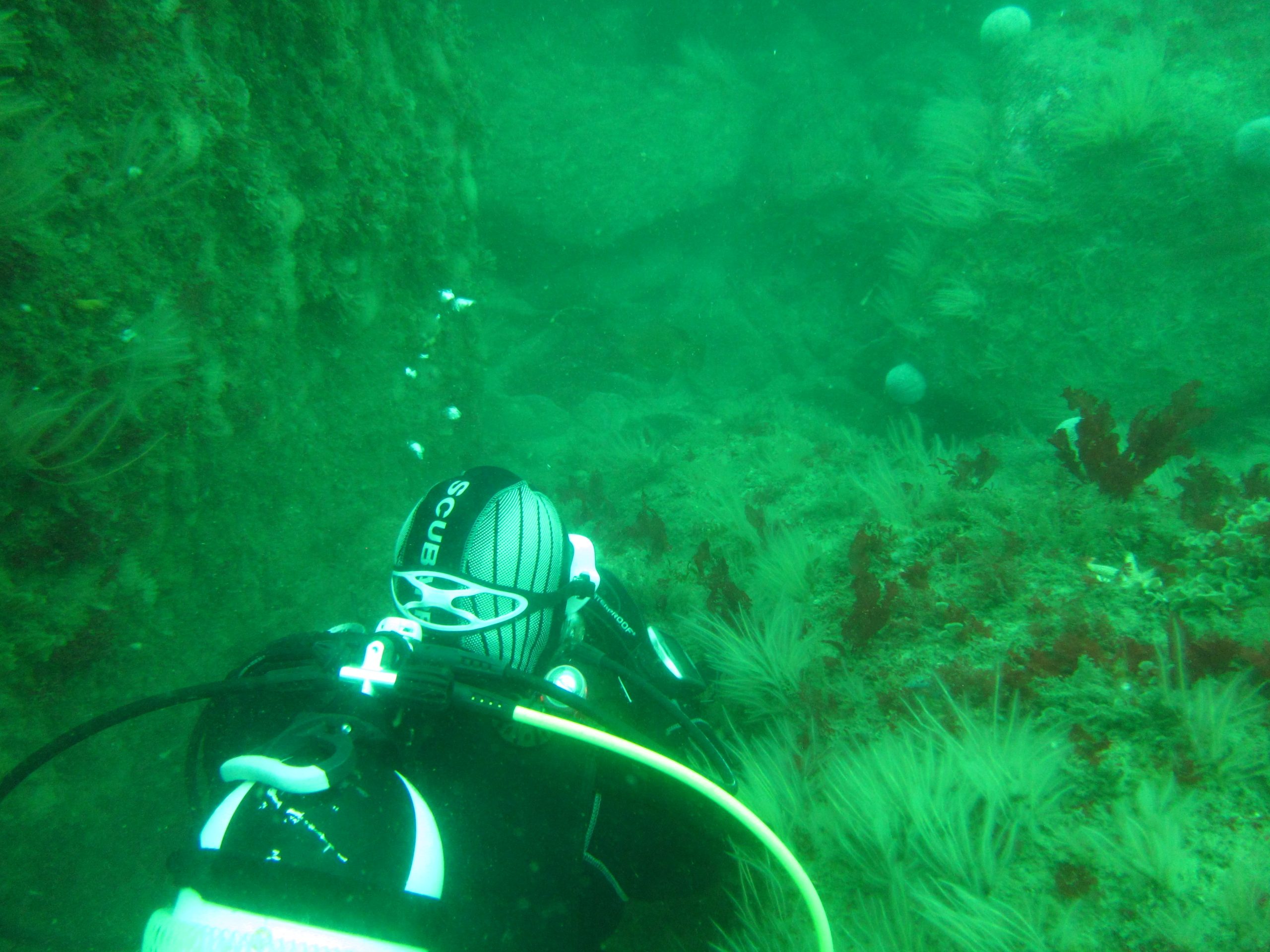 Vertical and very steep bedrock wall leading onto boulders at 14-27 metres. Rock silted with some crevices and fissures. There is a long rocky gully and swim through heading in a southerly direction between Large Skerries and Castle Island (from approx. 55.224020, -6.6338 to 55.222845, -6.6333894)