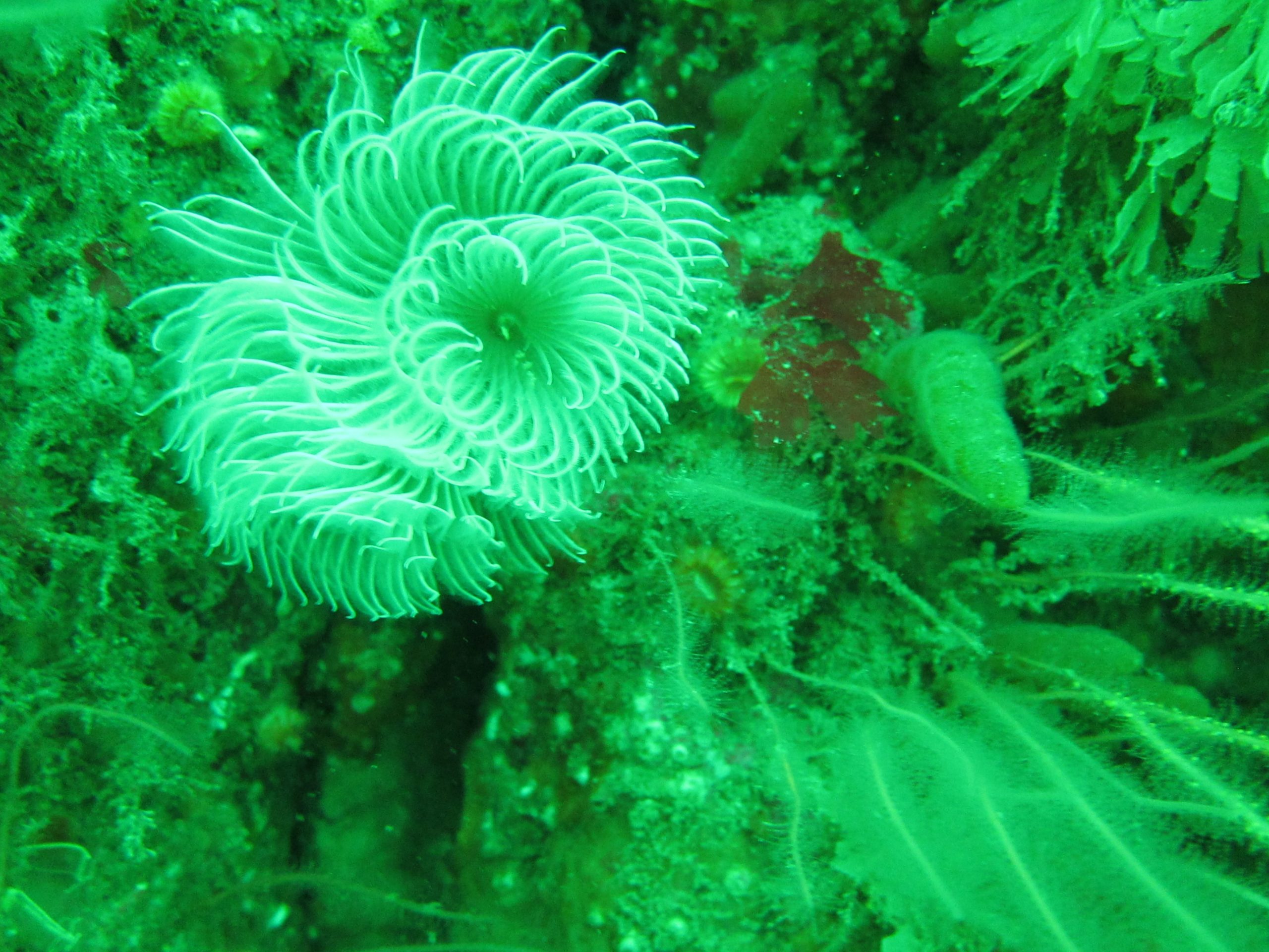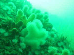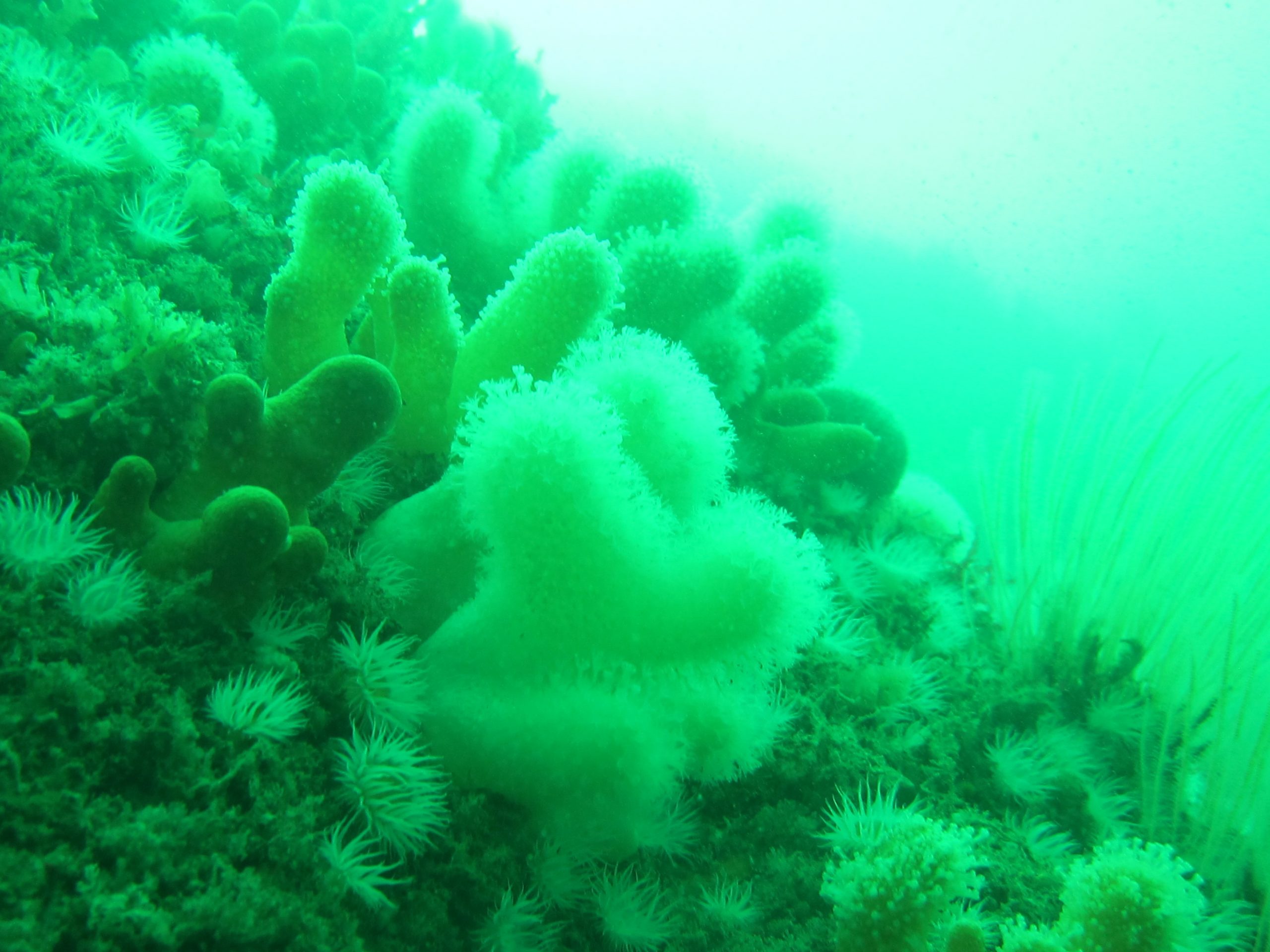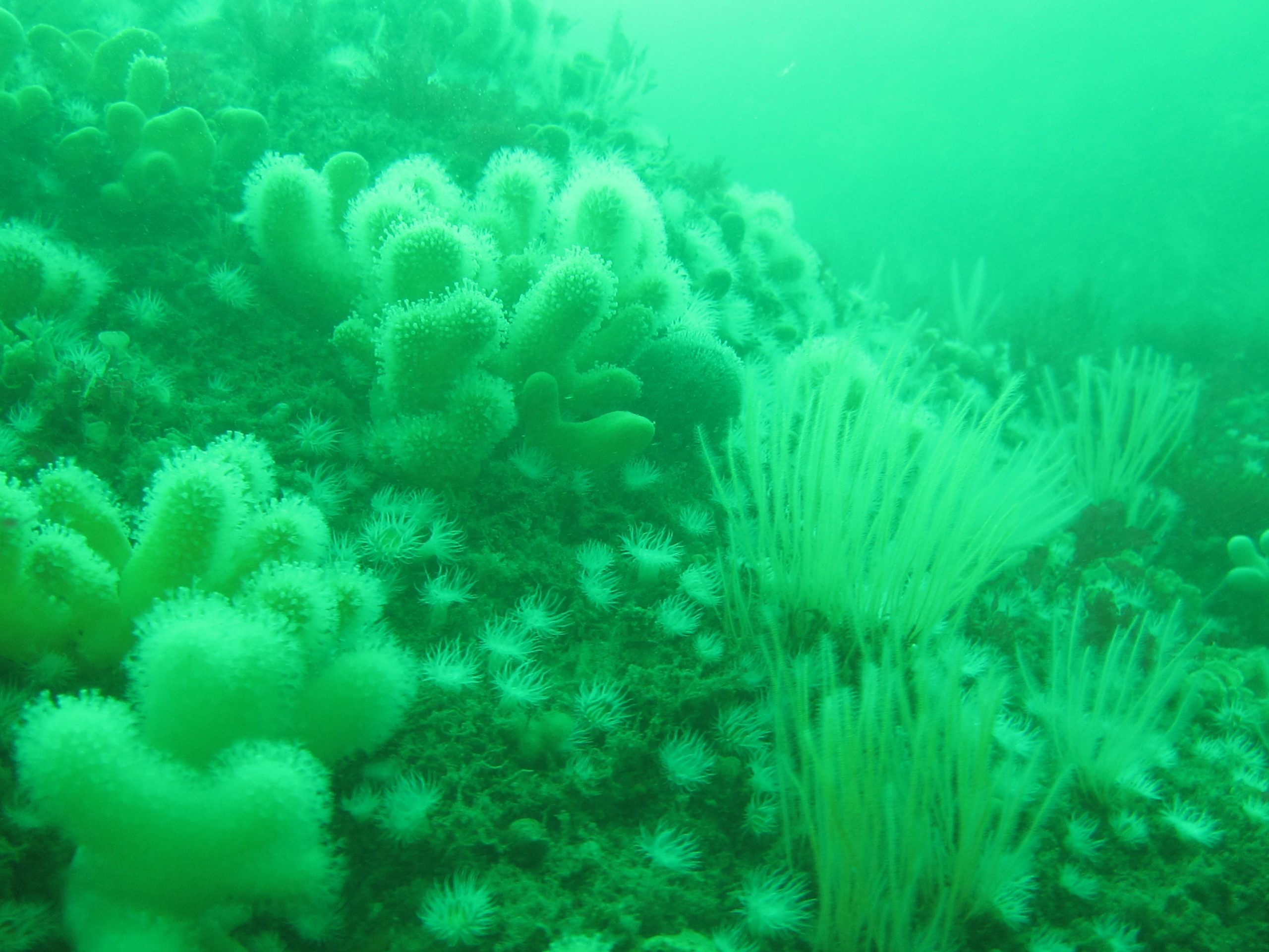 The upper parts of the wall support a kelp park, while the lower wall and boulders support a rich faunal community dominated by dead man’s fingers Alcyonium digitatum, and Devonshire cup corals Caryophyllia smithii , the sandelled anemone Actinothoe sphyrodeta, the finger bryozoan Alcyonidium diaphanum, urchins Echinus esculentus and the northern starfish Leptasterias muelleri.