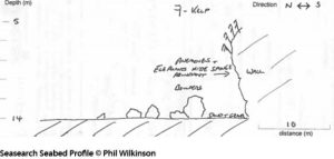 A limestone reef, with a wall going from 5-14 metres which leads to a sandy, gravelly seabed at the base with boulders.