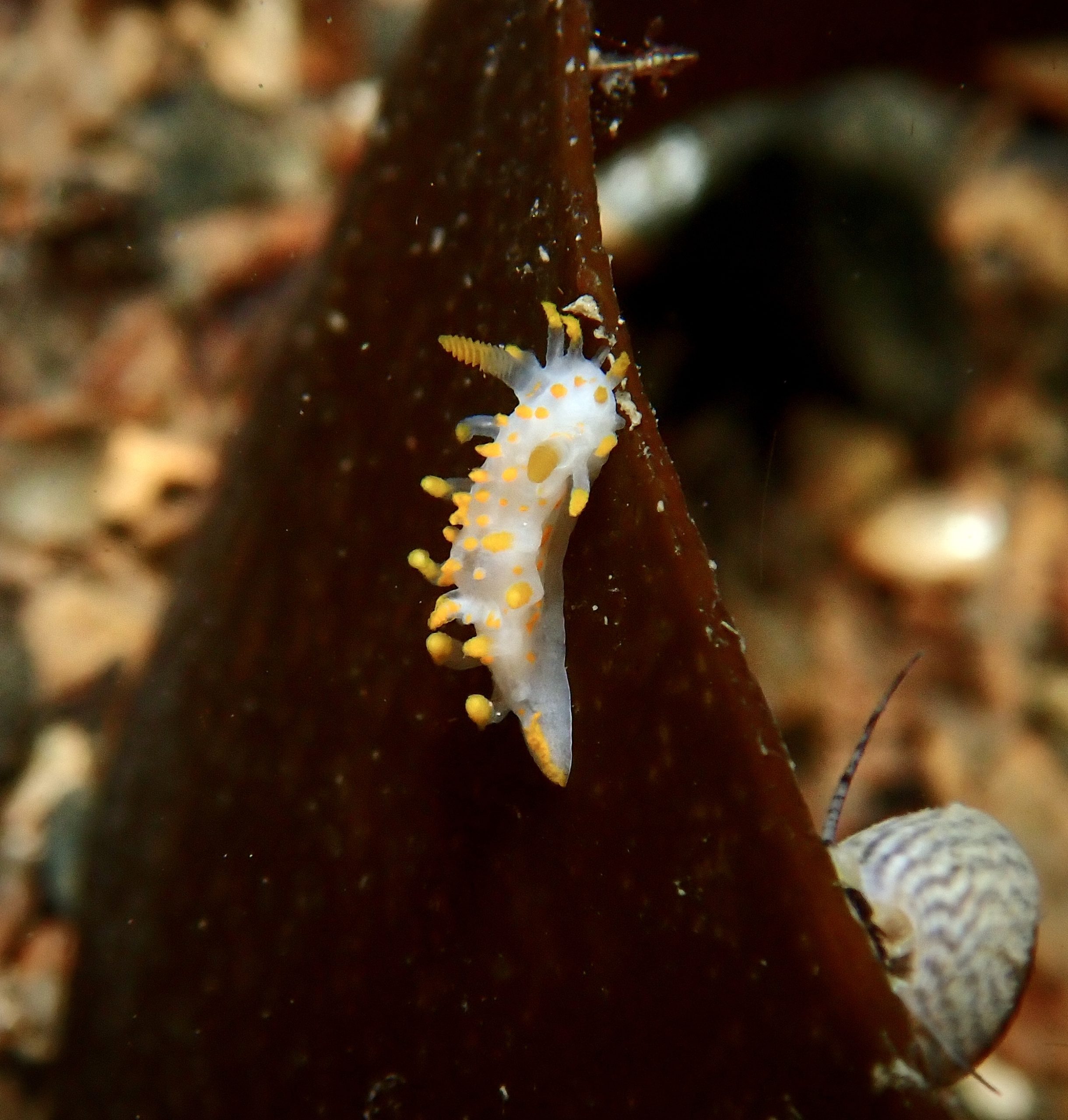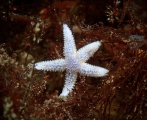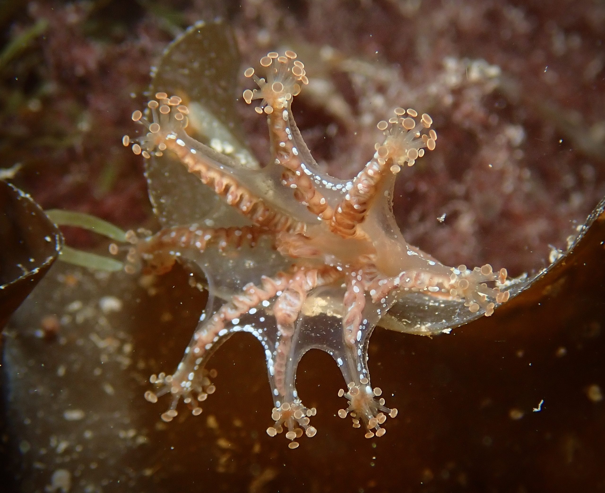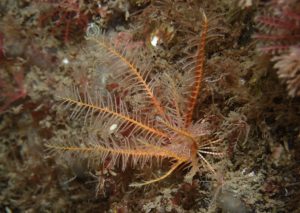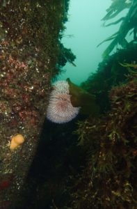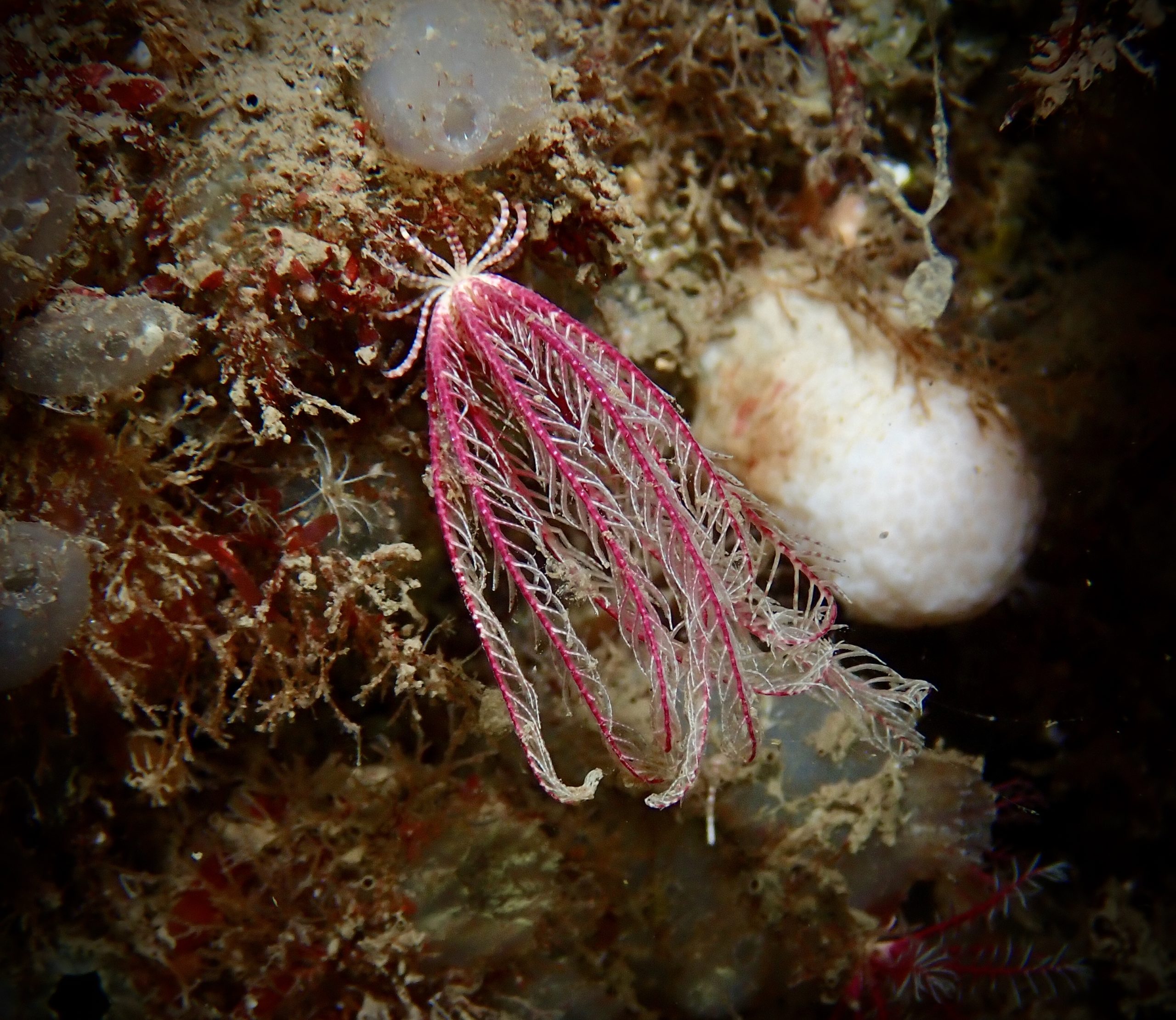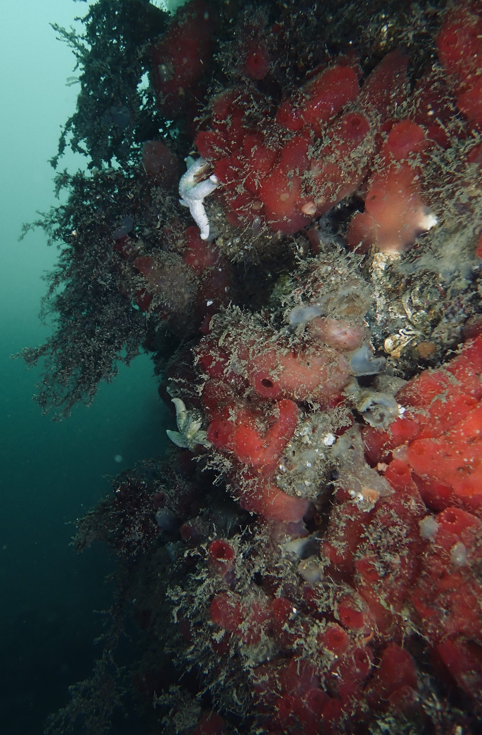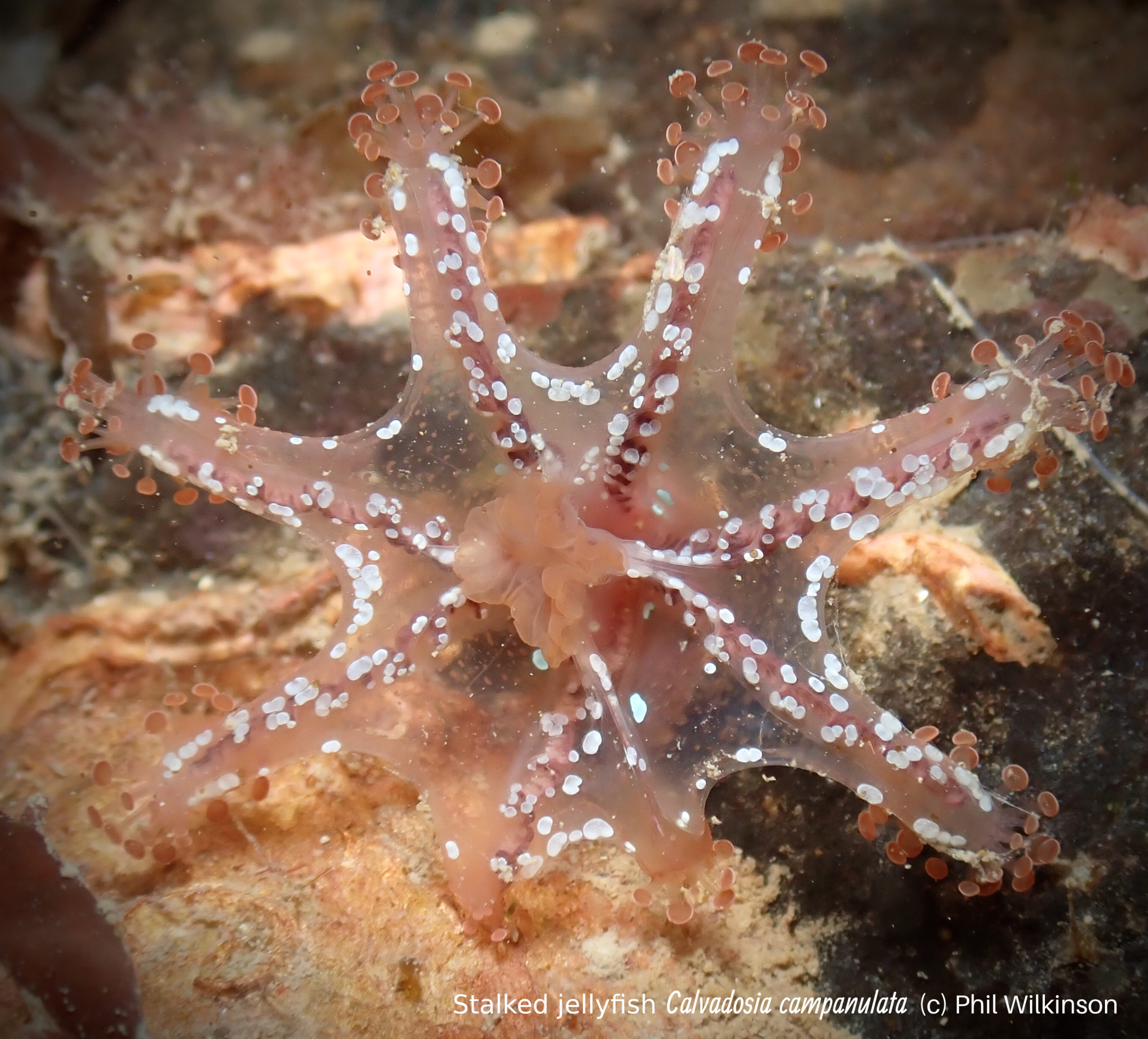 Anemones, sea squirts, urchins and featherstars are all found on the bedrock at this site. Mixed seaweed dominates the course sand where divers can see starfish, crabs and fish including gobies and dragonets. The rare nudibranch Hancockia uncinata was recorded here in August 2020. This was the first record for this species in Northern Ireland! The same diver, Phil Wilkinson then identified the stalked jellyfish Calvadosia campanulata when diving at the site again the following month. This species has only been recorded in Northern Ireland 4 times previously and is listed as a Northern Ireland Priority Species due to its rarity.
