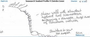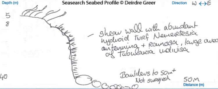 The wall has dense hydroid turf coverage, mainly Nemertesia antennina and Tubularia indivisa, with patches of dead man’s fingers Alcyonium digitatum. The rare Football sea squirt Diazona violacea has been recorded at this site.