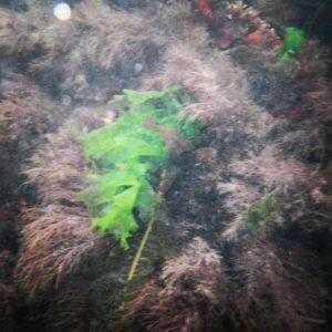 A diverse community of crustaceans, sea squirts and soft corals are found amongst a variety of alga species, including kelp, attached to the bedrock wall (at both sites either side of the harbour wall).