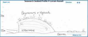 The stern of the wreck is covered in dead man’s fingers and sponges, with mobile fauna including sunstars, sea urchins, crabs and wrasse, mainly Cuckoo and Ballan.