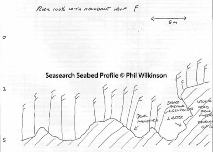 A rocky reef with steep sloping vertical walls, and some overhangs. At the base is a cobble and pebble seabed. There is a great dive on the north side of the rocks, down to around 20 metres depth.