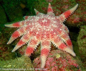 The bedrock and boulders are covered in kelp park, mixed seaweeds and faunal turf. A diversity of reef fish can be seen, including the two-spotted goby Gobiusculus flavescens and the Tompot blenny Parablennius gattorugine.
